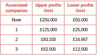 If a company has associated companies, this has an impact on the profit thresholds spoken about above, so the £50,000 lower limit and £250,000 upper limit reduce for each company.